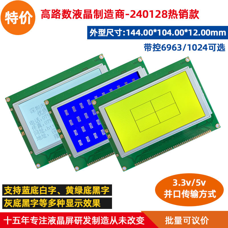 240128 | 144.0×104.0×13.0 | 114.0×64.0 | 0.40×0.40 | 5Vor3.3V | LED | T6963orSAP1024B | 圖片 |